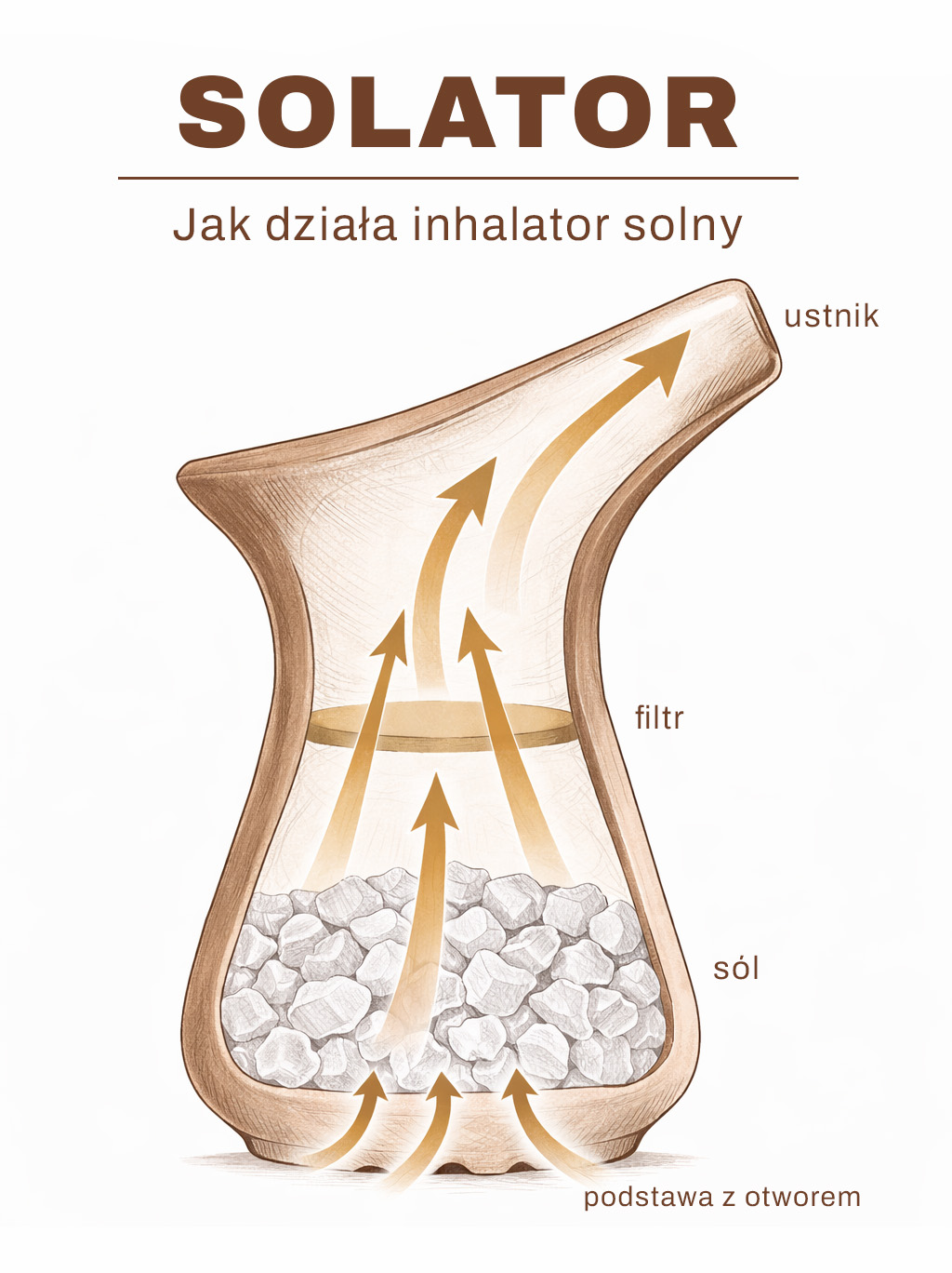 W Solatorze znajdują się wysokiej klasy kryształki soli wydobywane z pokładów soli powstałej 15 mln. lat temu w trakcie zaniku Morza Mioceńskiego. Podczas wdechu oczyszczają powietrze, które dostając się do płuc w wyniku regularnego stosowania wpływa na poprawę funkcjonowania układu oddechowego. Powietrze wdychane wzbogacone jest również w jony (min. sód, potas, wapń, magnez) oraz biopierwiastki (min. cynk, miedź, mangan, chrom) co ma wpływ na prawidłową przemianę materii oraz poprawę ogólnej kondycji i sił witalnych organizmu.